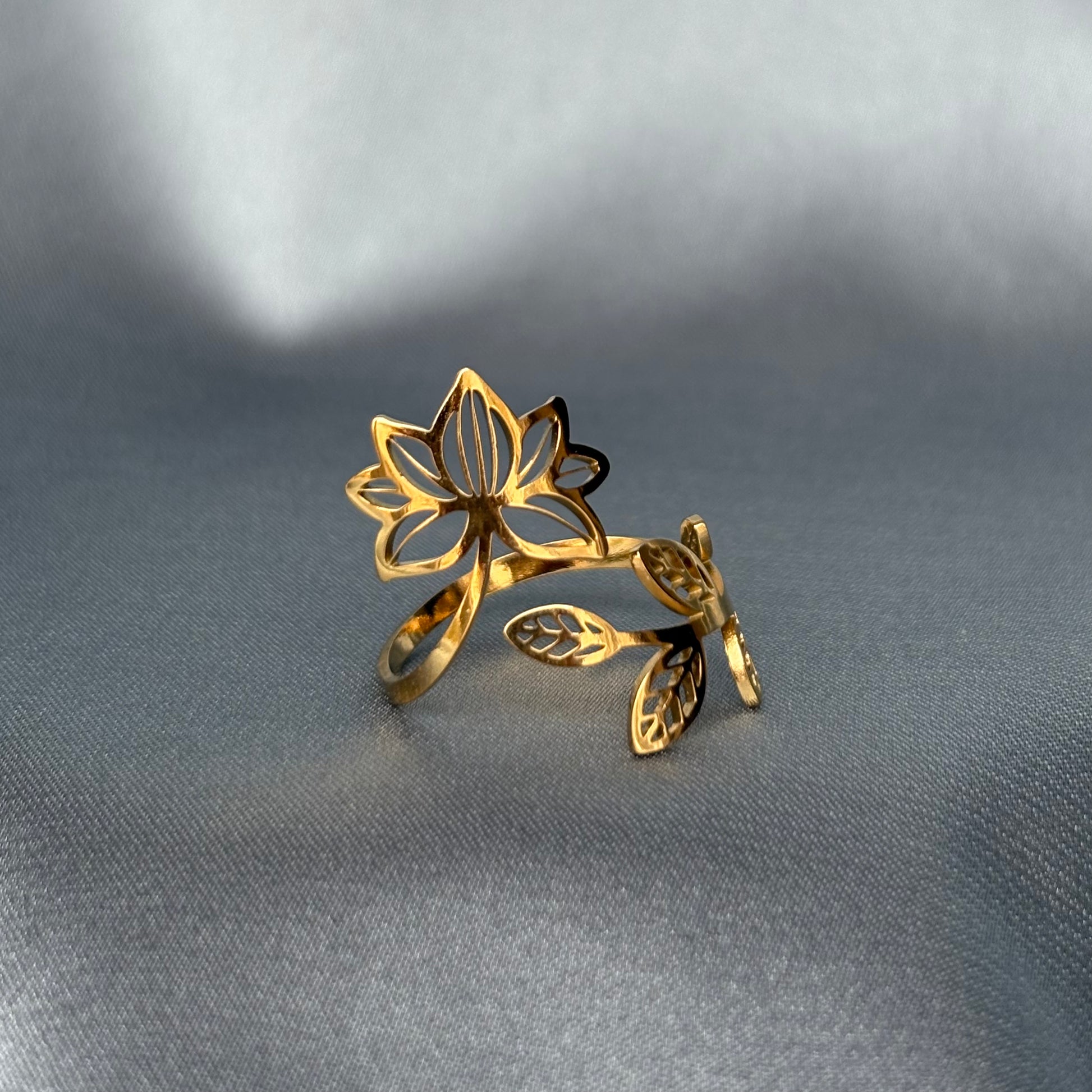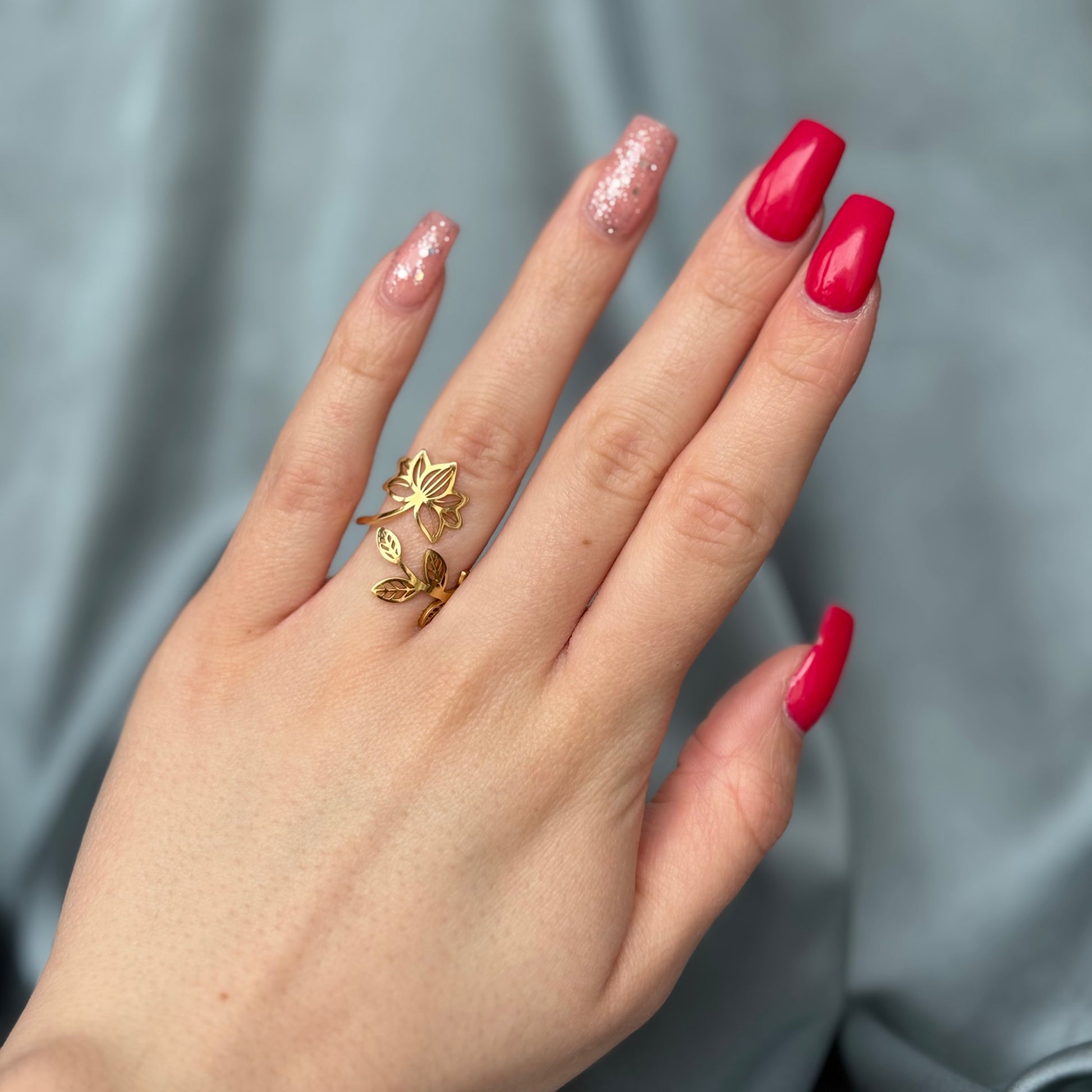 Embellissez votre look avec la bague Véra en acier inoxydable ! Composée de délicates feuilles et d'une fleur, cette bague apportera une touche de nature à votre tenue.